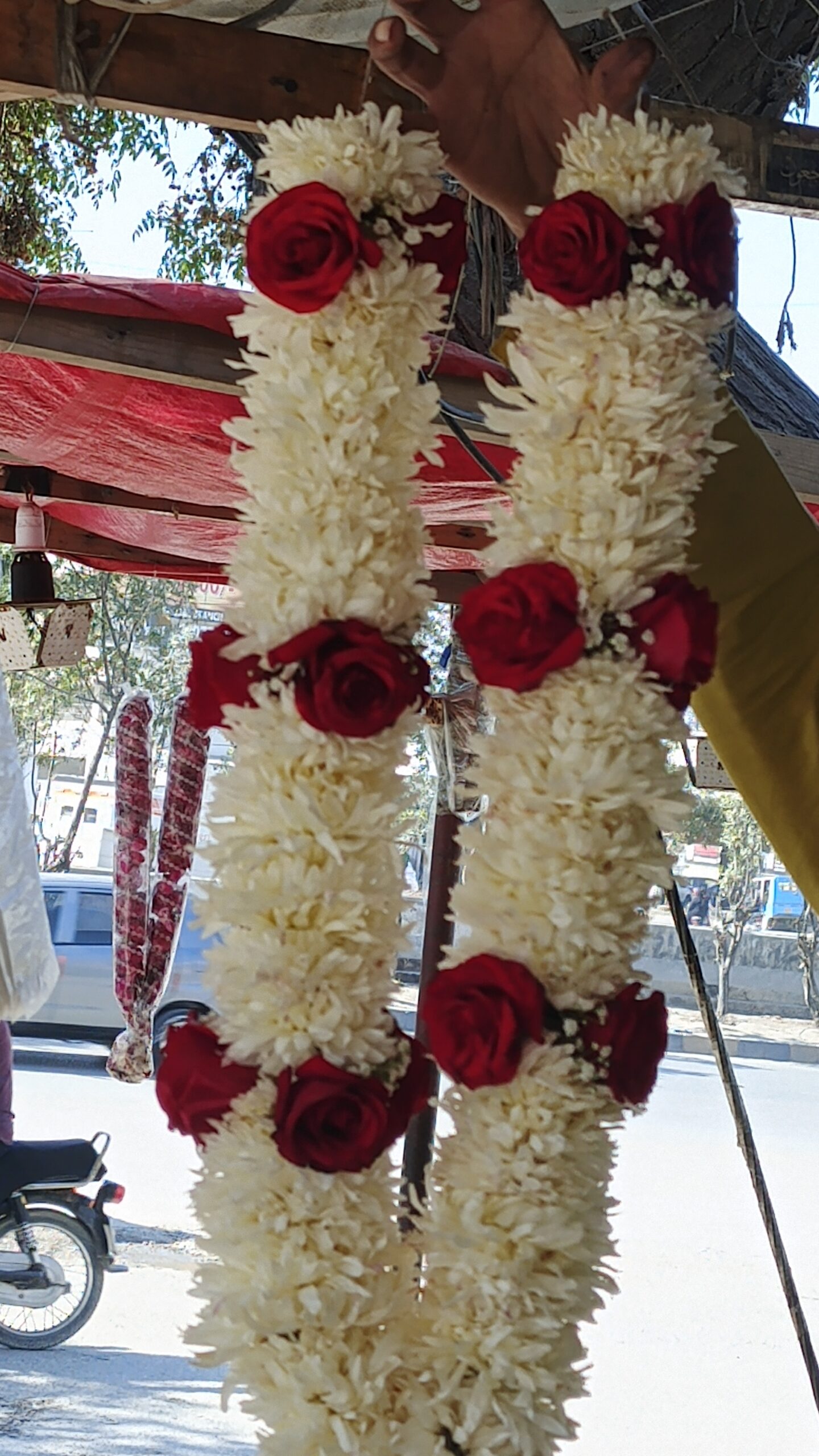 The design is accented with deep maroon sections and metallic gold tinsel rings that catch the light, making it the perfect accessory for high-profile stage appearances, political rallies, or energetic wedding entries. Strategically placed red heart medallions and a multi-toned floral tassel at the base provide a finished, artisanal feel. Built on a sturdy yet lightweight core, this Haar maintains its perfectly cylindrical shape regardless of movement or weather, ensuring a majestic presence throughout your entire event.