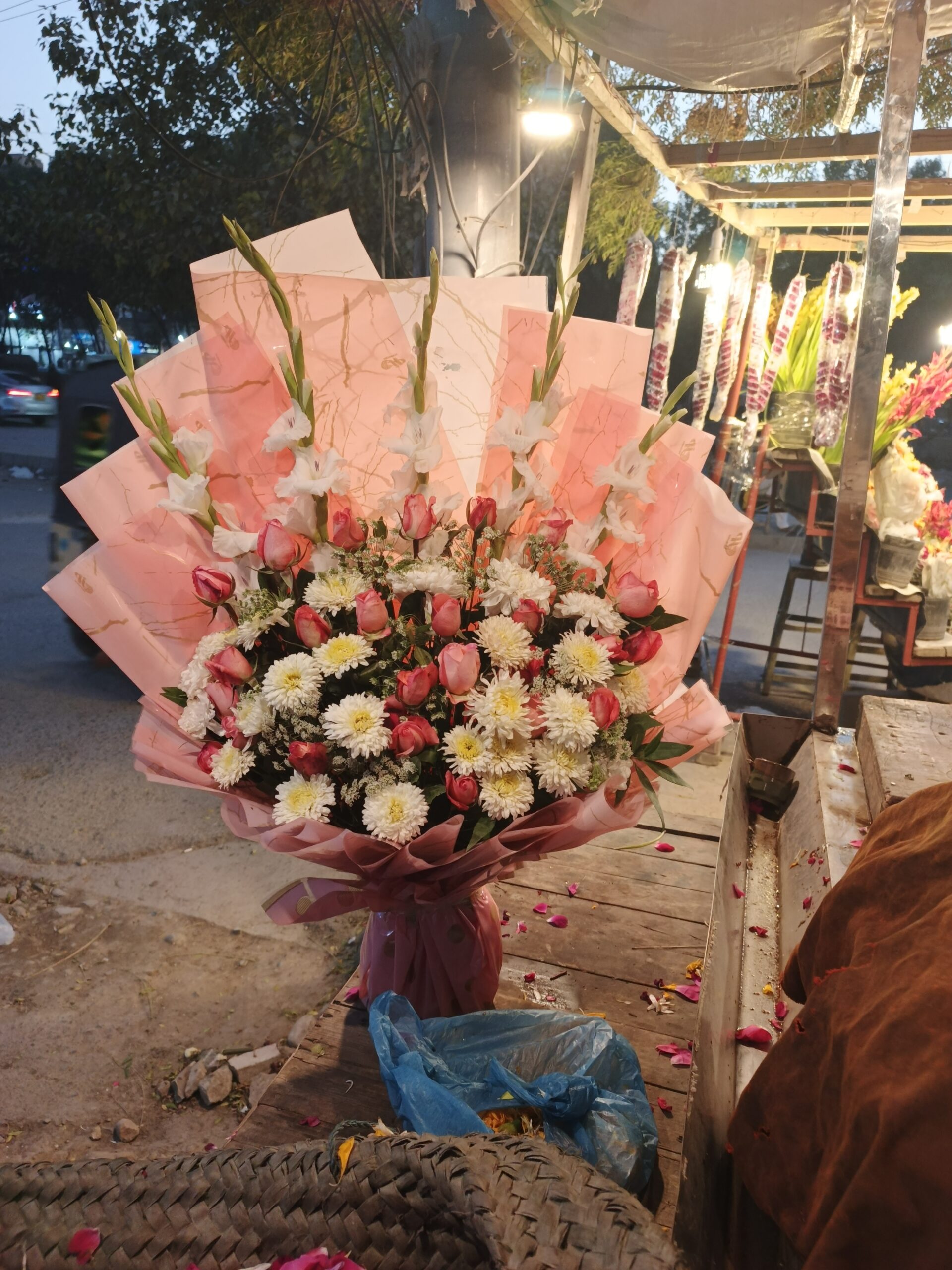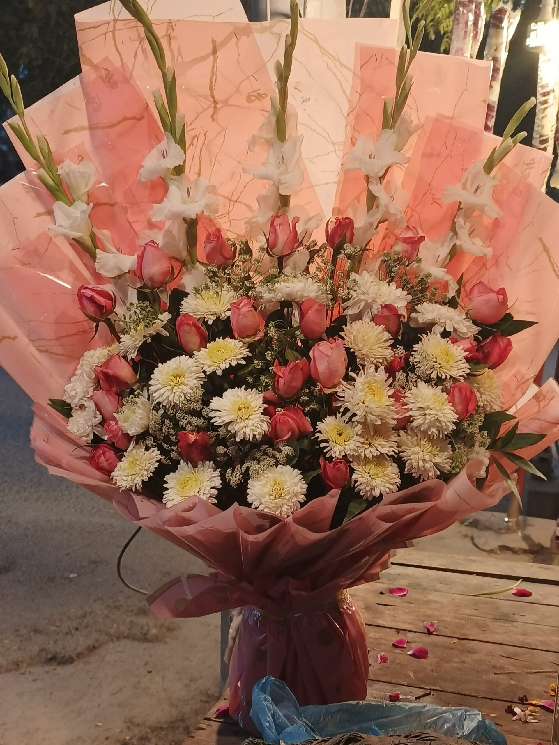 A beautiful mixed flower bouquet featuring fresh roses, chrysanthemums, and gladiolus, elegantly wrapped in a soft peach marble paper — perfect for birthdays, anniversaries, celebrations, and heartfelt surprises.