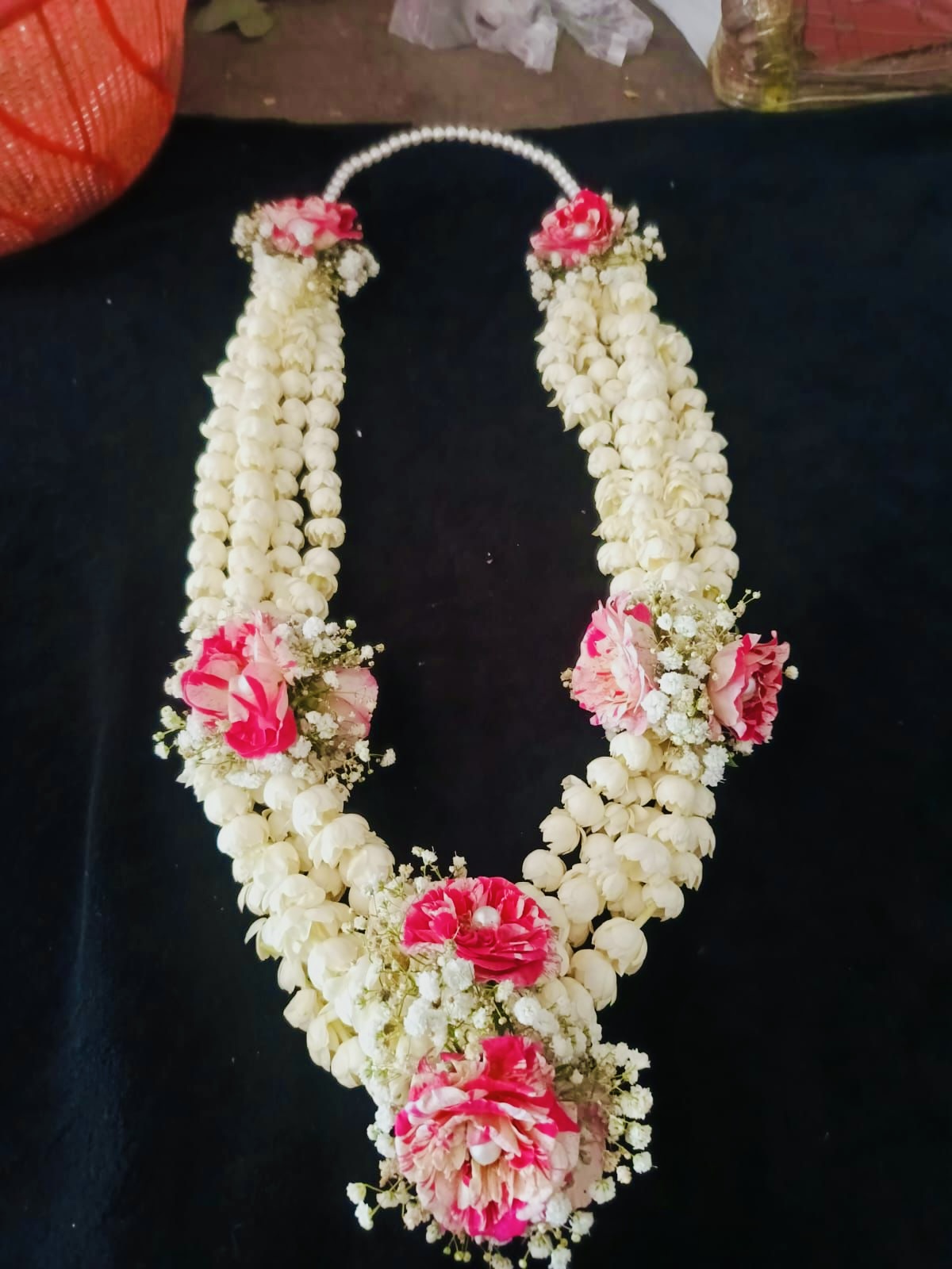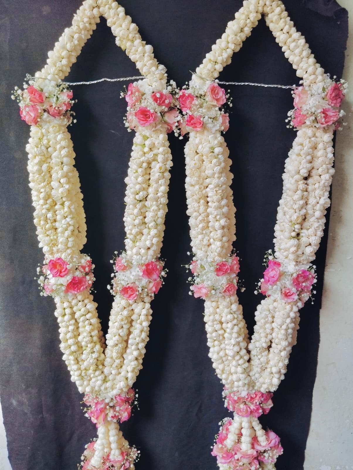 To enhance the beauty of the pink motiyan, delicate clusters of baby’s breath are carefully added between the buds. Known scientifically as Gypsophila paniculata, baby’s breath features tiny white blossoms that look light and cloud-like. These miniature flowers add softness and volume to the garland, creating a beautiful contrast against the pink motiyan while making the overall design appear fuller and more graceful.