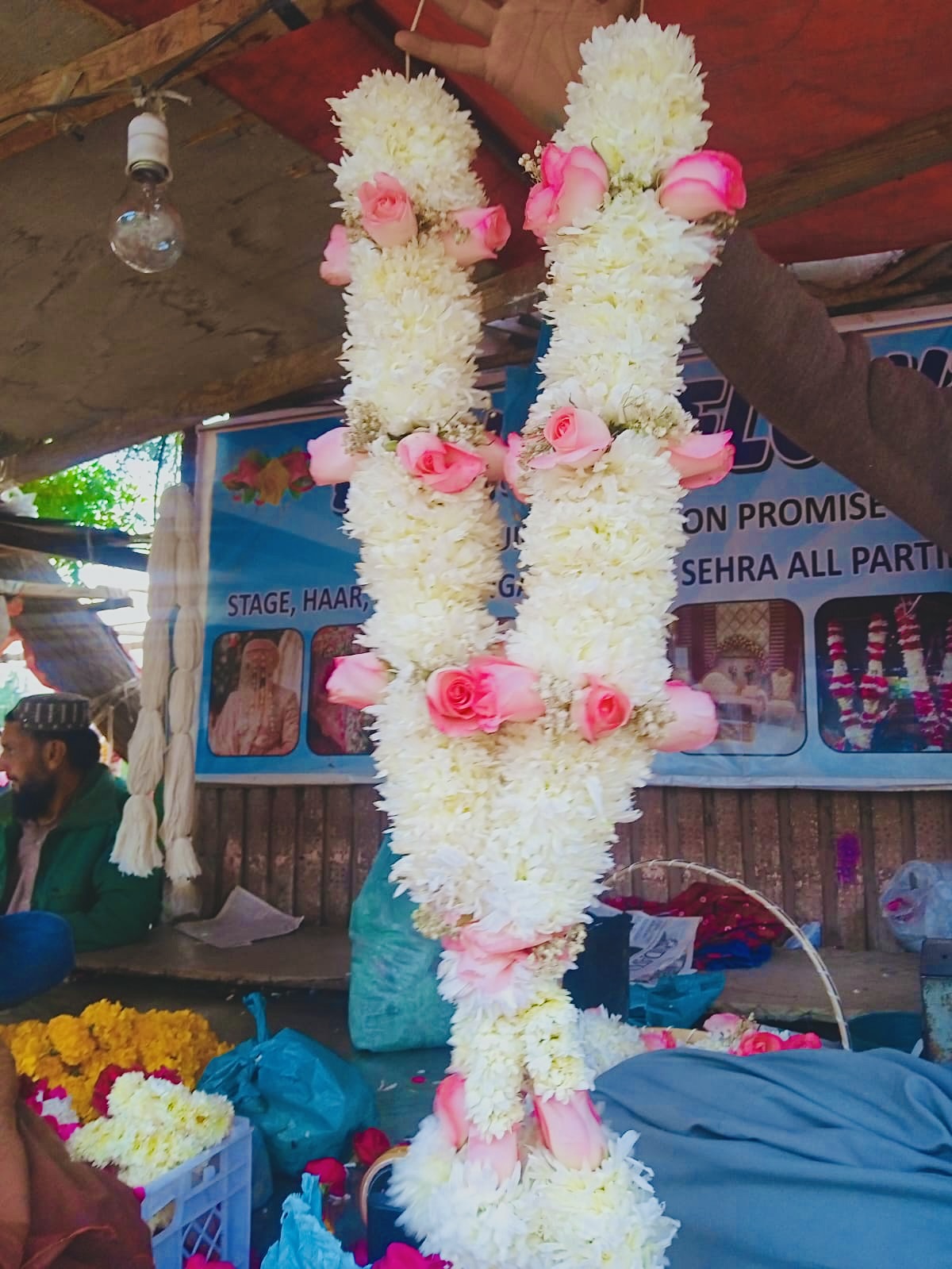Handcrafted by skilled florists, each pink and white haar is carefully arranged to ensure a balanced and flowing design. The garland is designed to drape naturally around the neck, creating a graceful cascade that enhances the overall elegance of the wearer. The fresh flowers also release a gentle, pleasant fragrance, making the haar not only beautiful to look at but also a delight to experience.