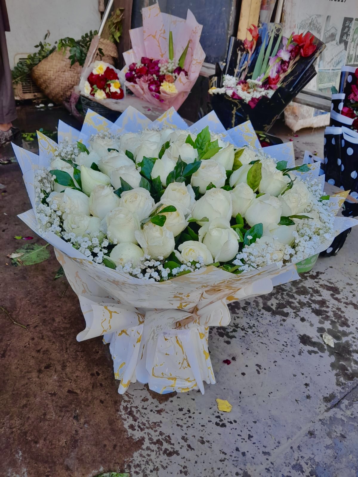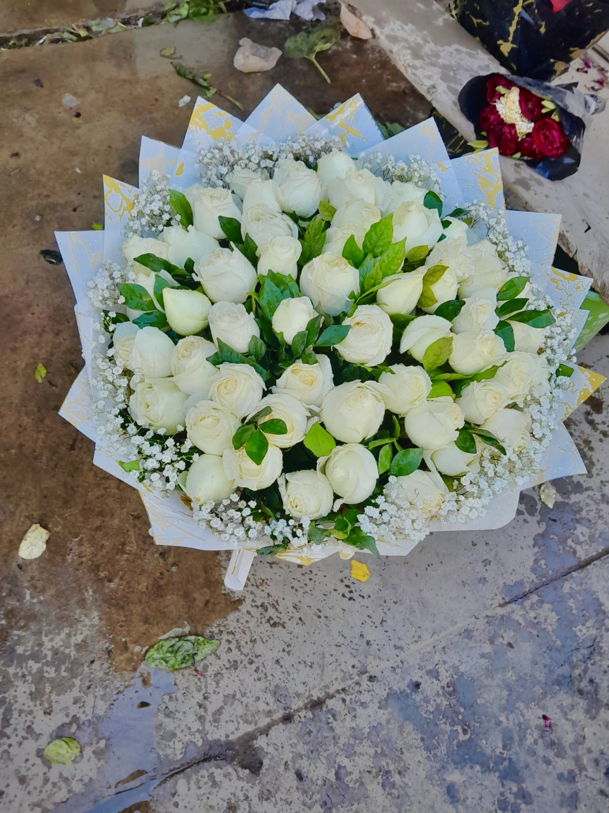 A white rose and baby’s breath bouquet is a graceful and timeless floral arrangement that radiates elegance, purity, and gentle beauty. The bouquet is designed with fresh white roses as the main focal flowers, surrounded by delicate clusters of baby’s breath that enhance its soft and romantic appearance.
