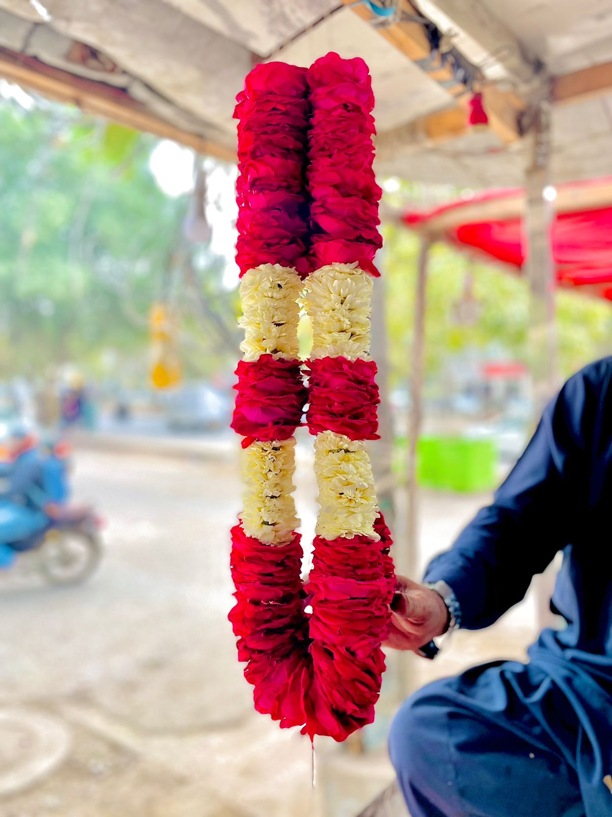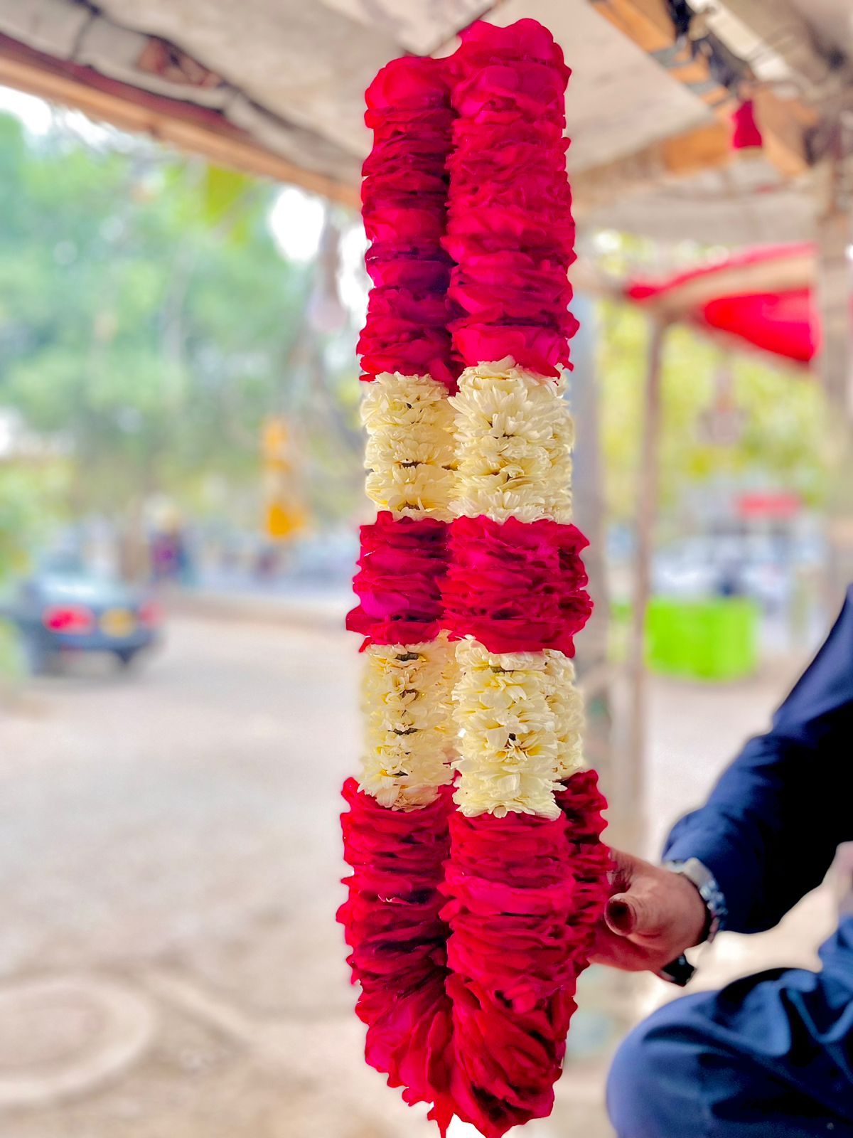 red and white daisy garland is a bright and cheerful floral garland made with vibrant red daisies and fresh white daisies. The flowers are carefully arranged and hand-strung together to create a balanced and eye-catching design. The bold red petals combined with the soft white daisies produce a beautiful contrast, giving the garland a lively and elegant appearance.