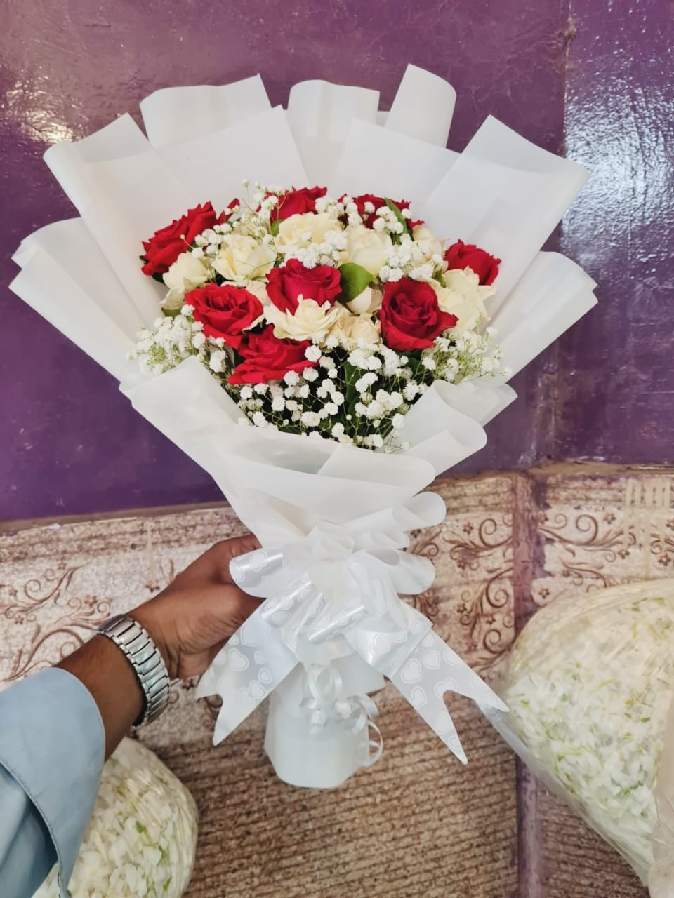 Complementing the red roses are pure white roses, which bring a sense of softness and serenity to the bouquet. White roses represent purity, grace, and new beginnings. Their creamy white petals create a beautiful balance with the deep red tones, making the bouquet feel both romantic and sophisticated. The contrast between red and white roses adds depth and harmony, symbolizing unity and heartfelt emotions.