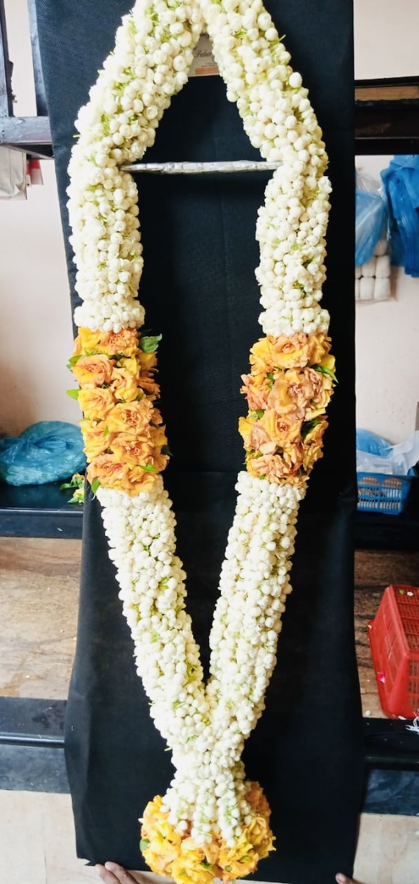 The garland is carefully handcrafted using fresh flowers threaded together on strong cotton thread or floral wire to ensure durability and fullness. Yellow roses symbolize happiness, warmth, and celebration, while motiyan flowers add a traditional touch and a lovely natural fragrance. This garland is commonly used for weddings, engagements, cultural ceremonies, festive decorations, and special celebrations, bringing beauty and freshness to the occasion.
